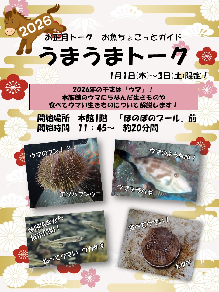 お正月3が日限定! ~お正月トーク お魚ちょこっとガイド~ 「うまうまトーク」開催します!! 2026年の干支「ウマ」にちなんだ生きものの解説を行います。 ●開始場所:本館1階「ほのぼのプール」前 ●開始時間:11時45分~ 約20分間 皆様のお越しをお待ちしています(^^)