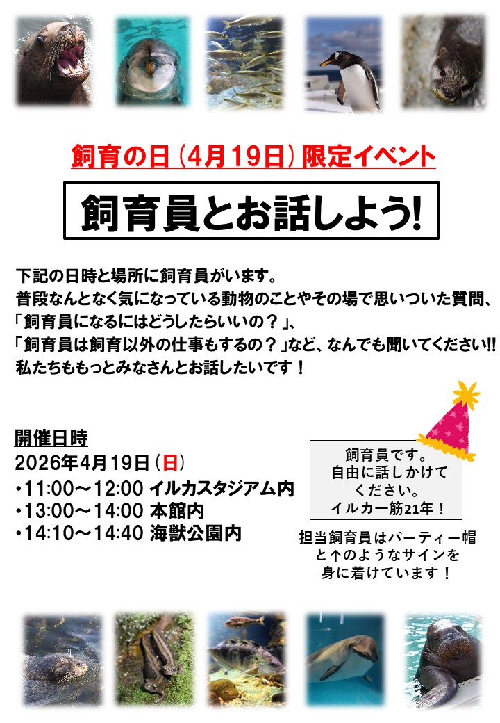 4月19日(日)は飼育の日! 飼育の日限定イベント「飼育員とお話しよう!」を開催します! 詳細はポスター画像をクリック! ぜひご参加ください(^^♪ ※飼育の日とは、飼育係の仕事内容を通して動物園・水族館に興味をもってもらうことを目的として、公益社団法人日本動物園水族館協会が2009年に定めました。